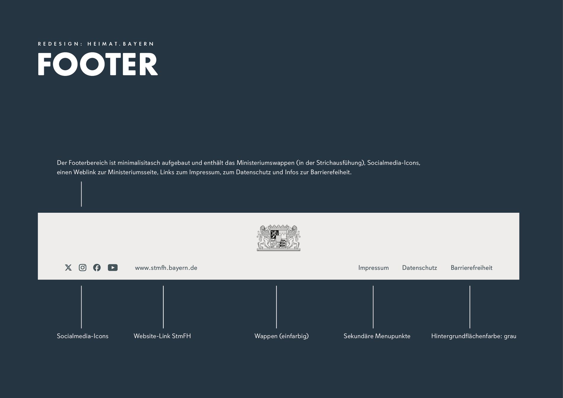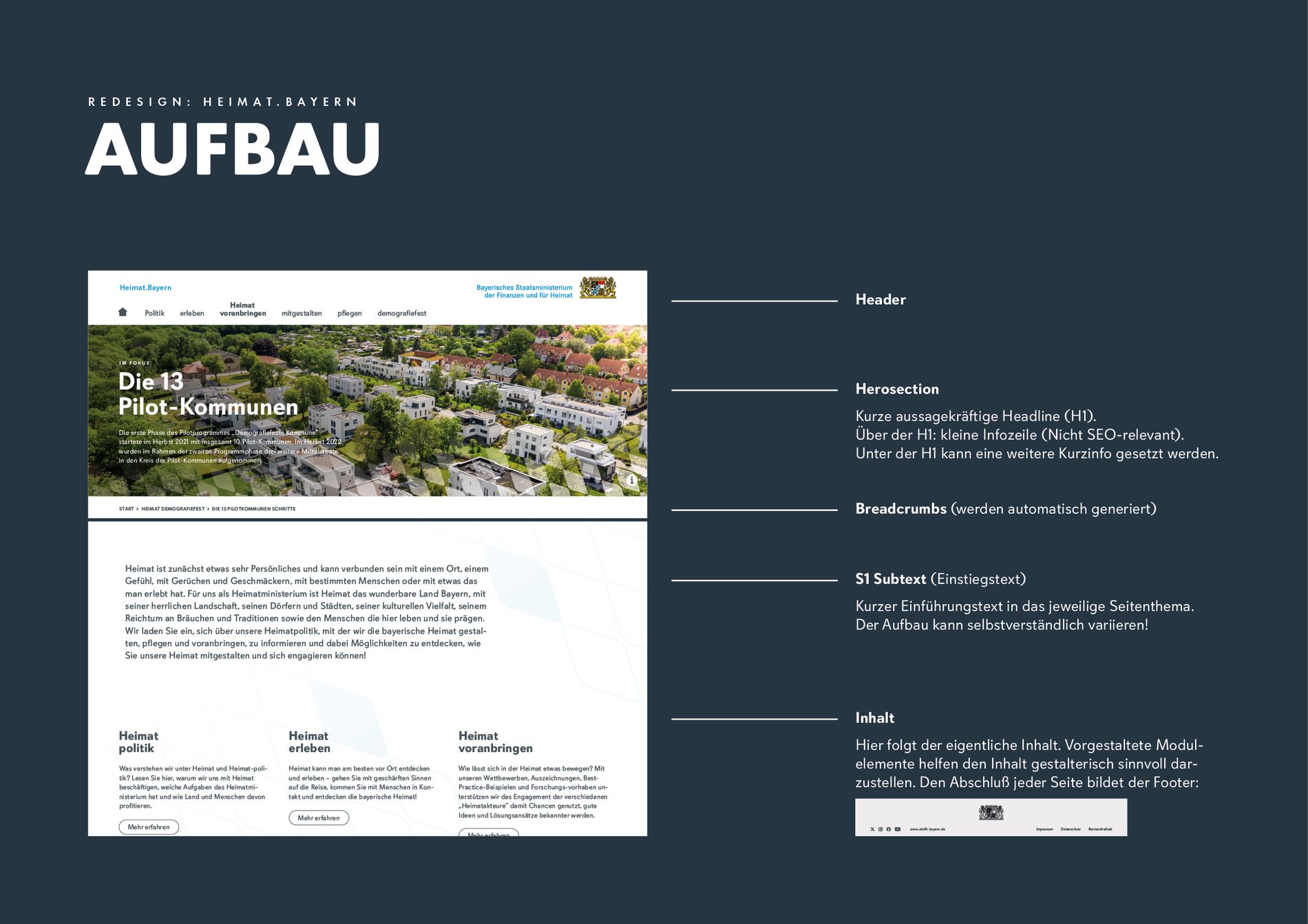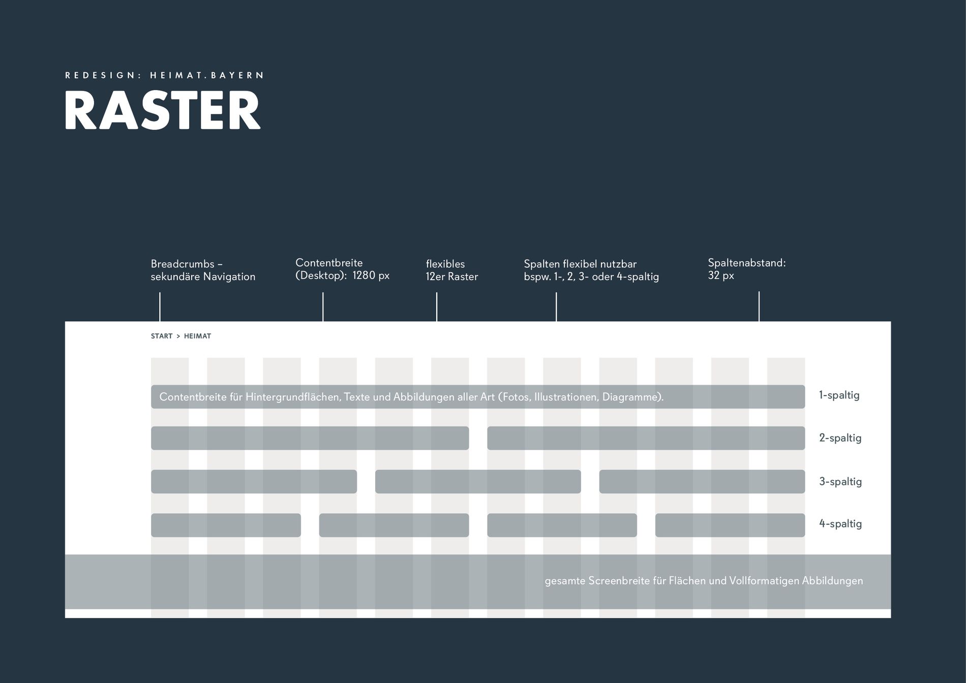 Nach der strategischen Phase mit gemeinsamer Auswertung ging es an die Umsetzung: Für heimat.bayern entstand ein klar strukturiertes, modernes Webdesign, das die Identität des Heimatministeriums authentisch transportiert. In den folgenden Screens zeigen wir zentrale Elemente der Gestaltung: das 12-spaltige Raster, das sowohl Struktur als auch Flexibilität ermöglicht, das konsistente Farbkonzept und die gut lesbaren Schriften.