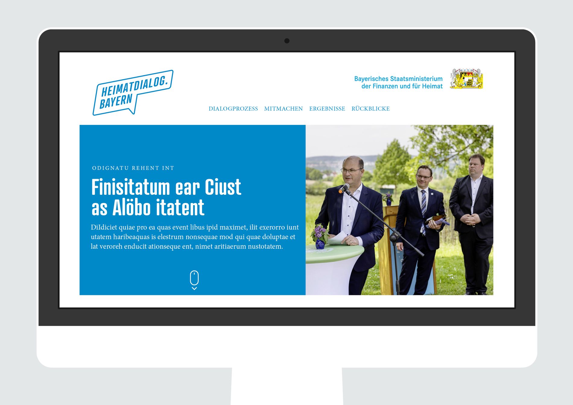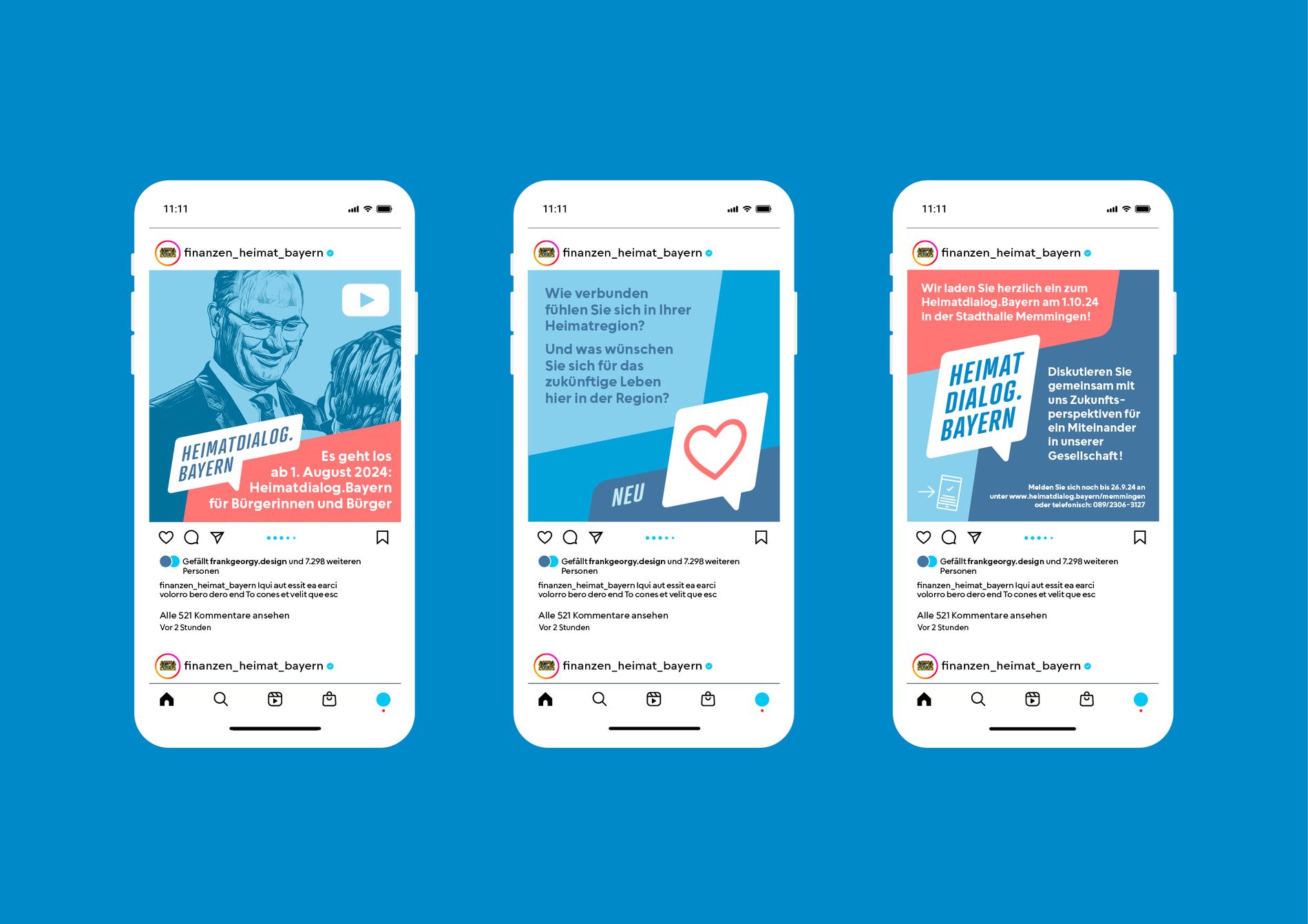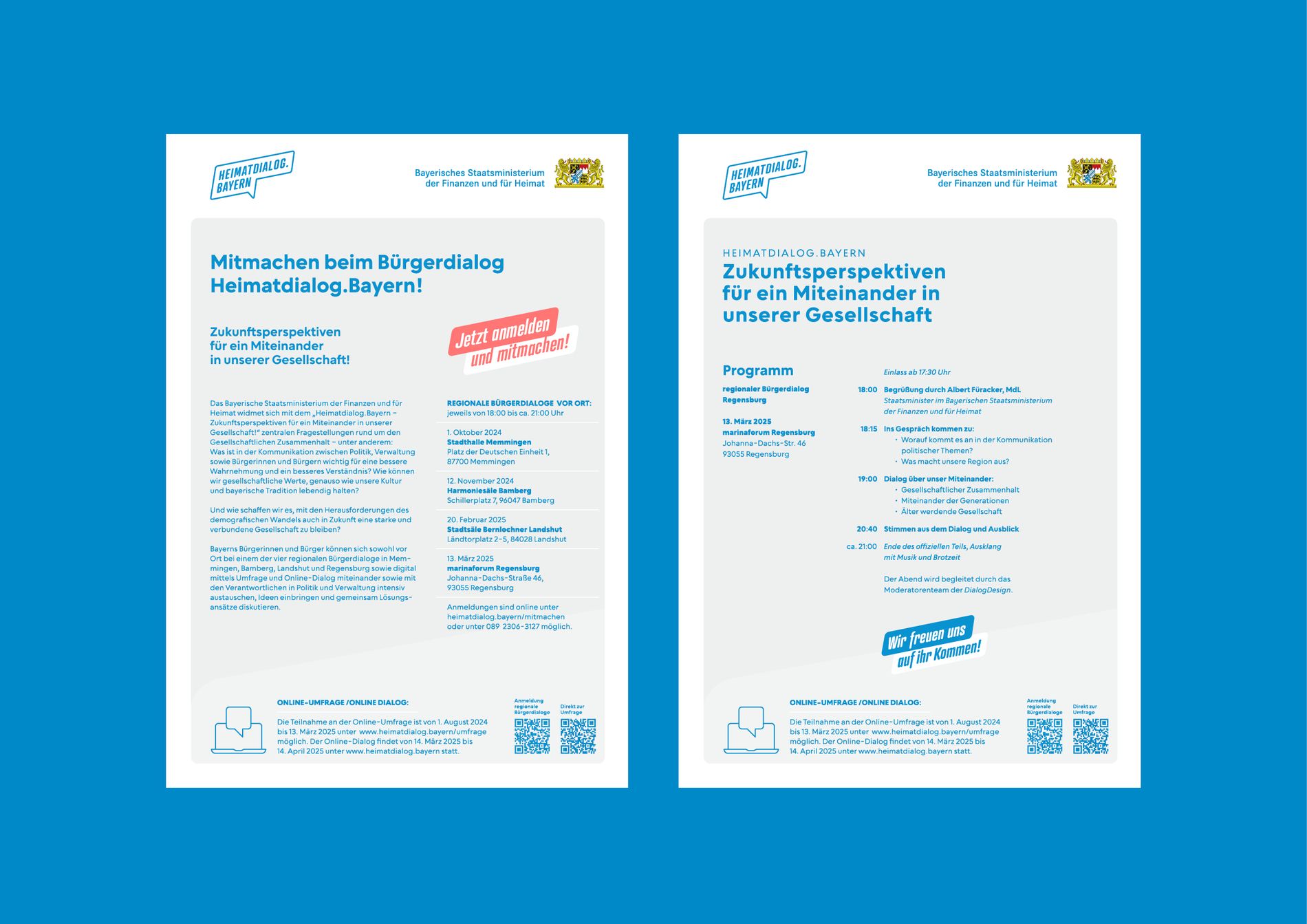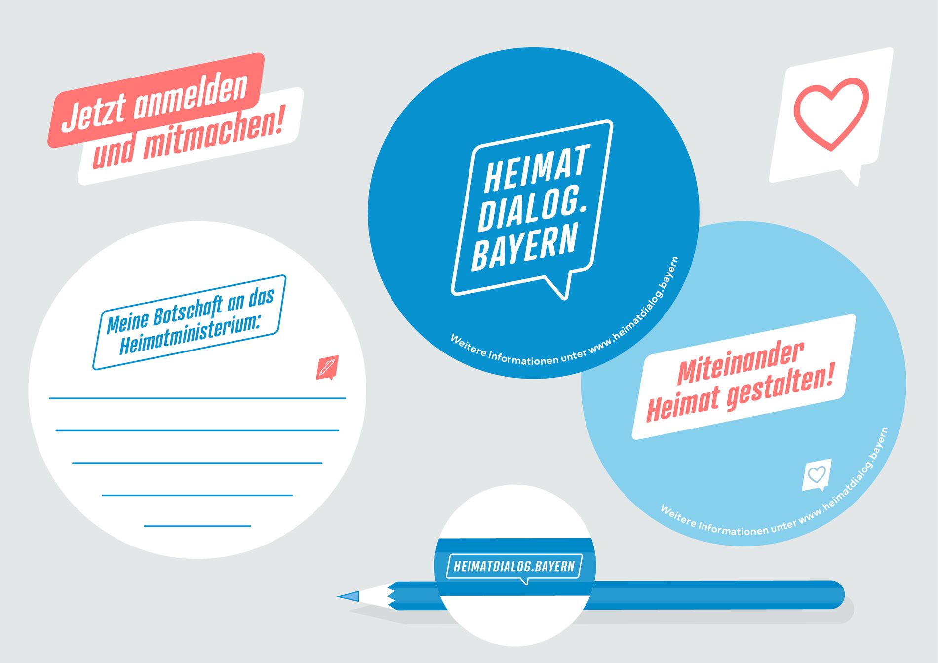 Für den Heimatdialog.Bayern entstand eine visuelle Identität für den Austausch zwischen Bürger:innen, Politik und Verwaltung – mit Logo, Webdesign, Social Media und Print.