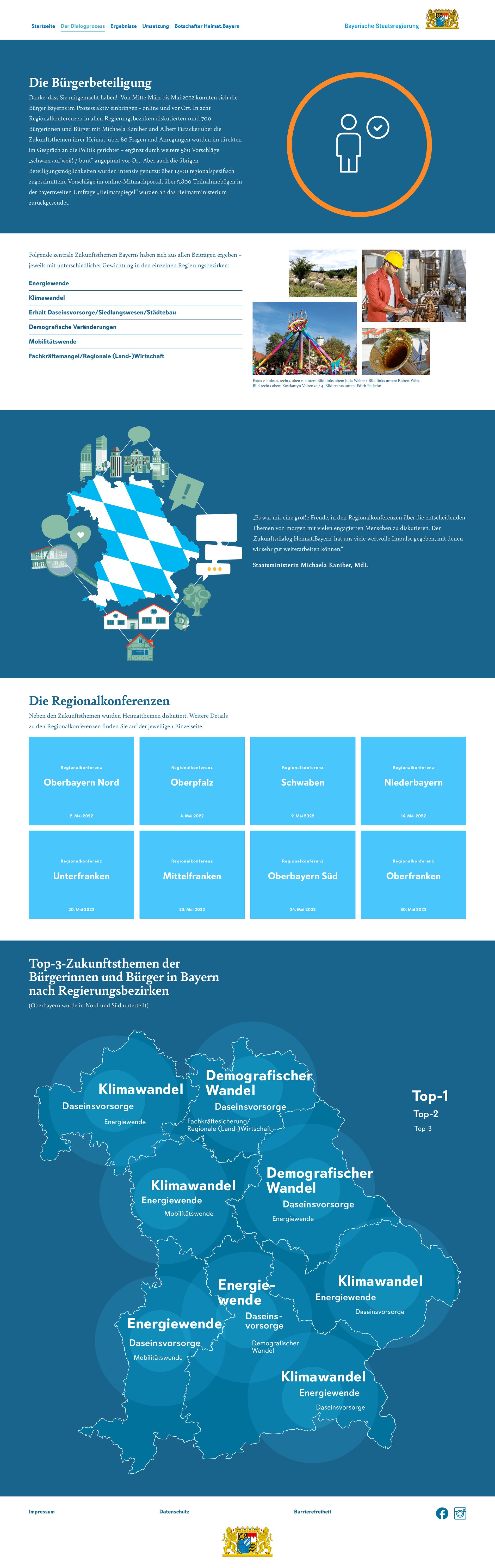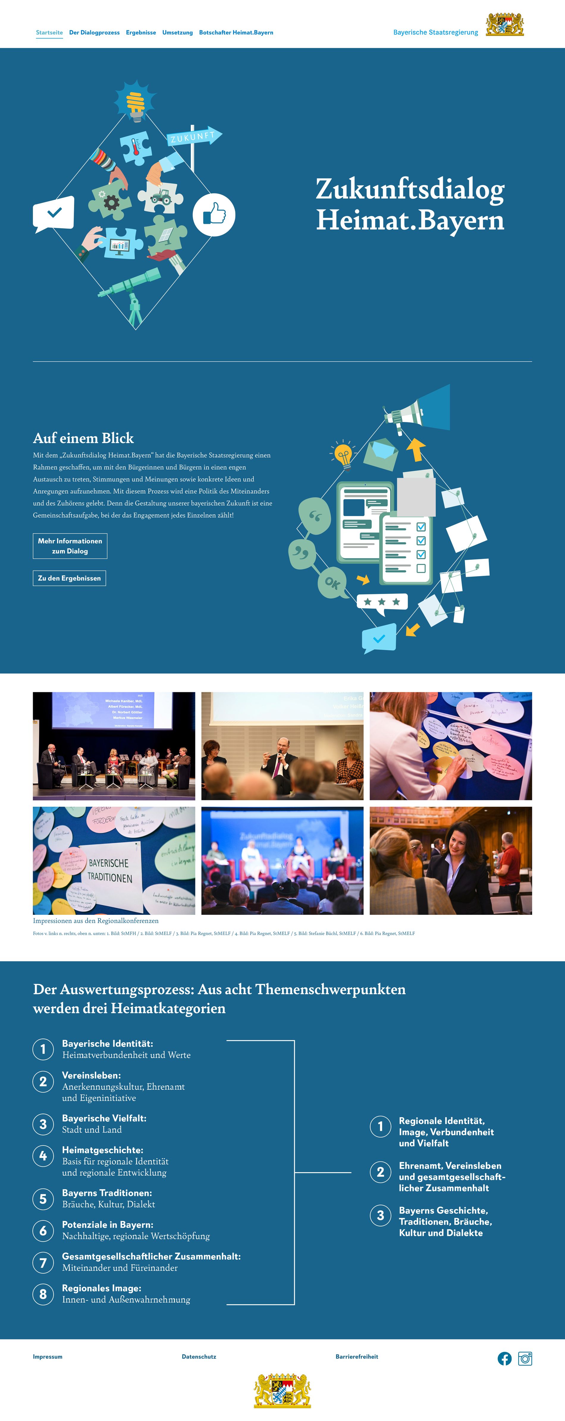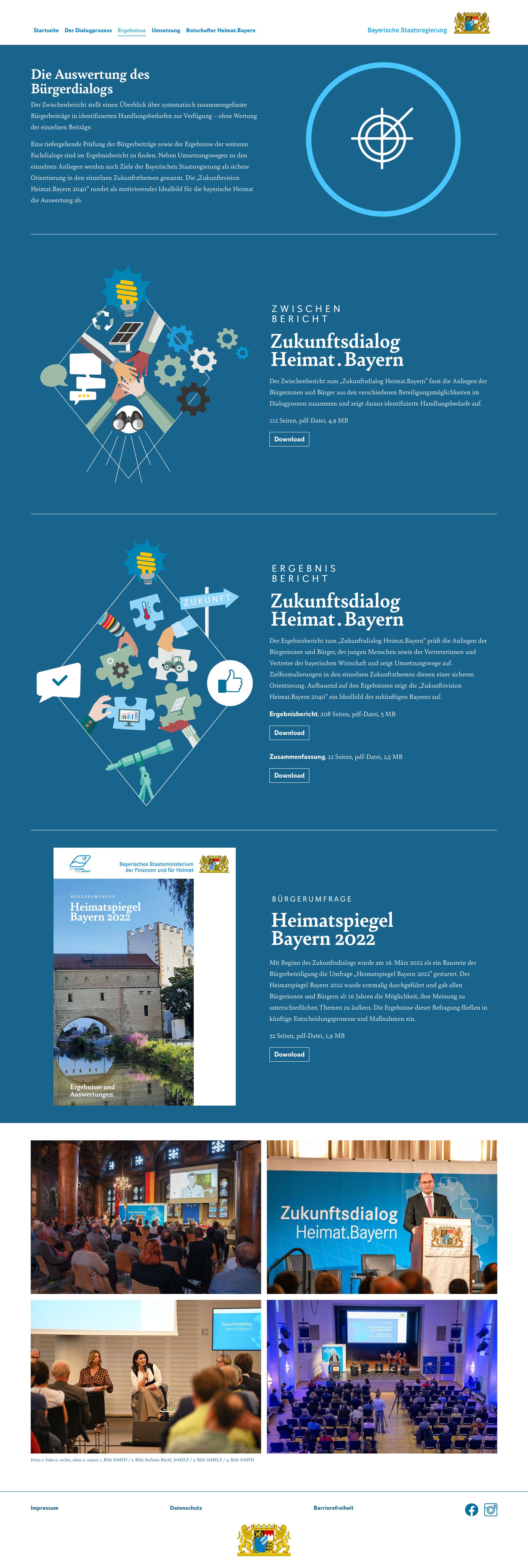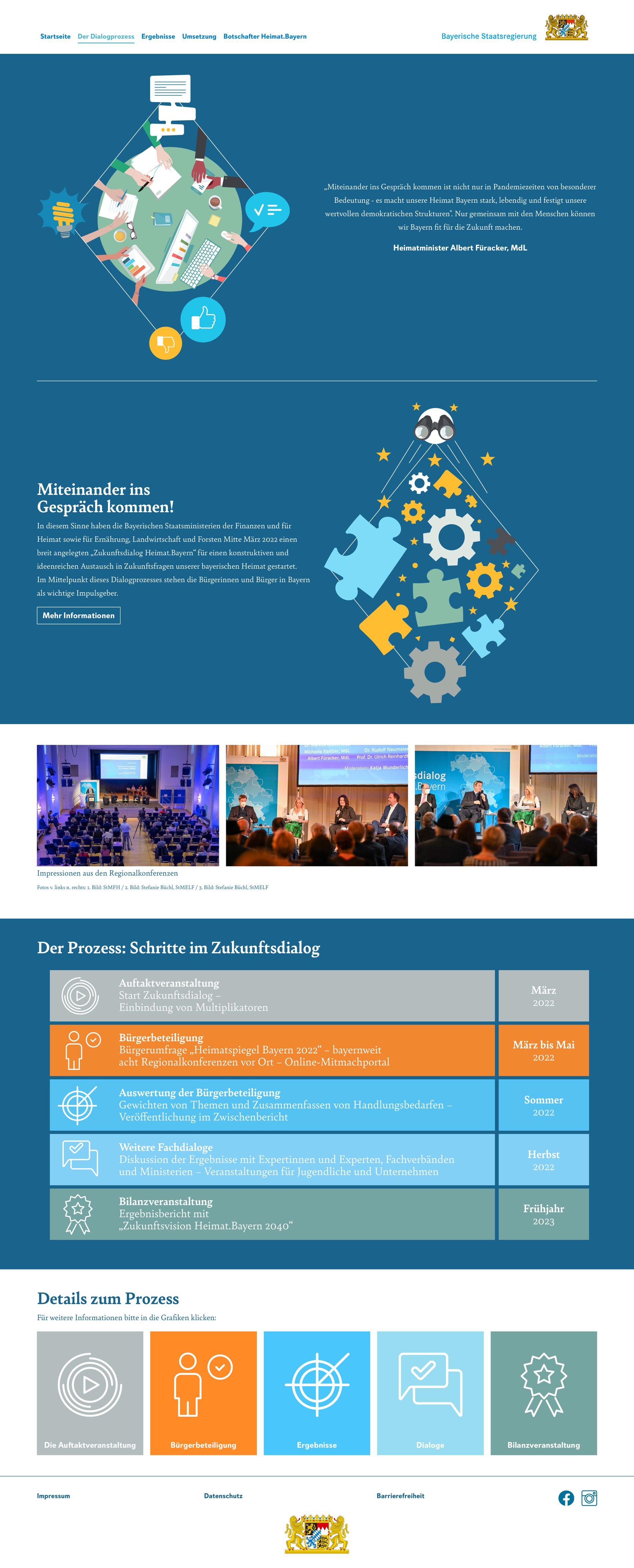 Für den Zukunftsdialog.bayern entstand ein flexibles Designsystem mit klarer Formsprache. Die Website informiert, vernetzt – und lädt zum Mitmachen ein: intuitiv, strukturiert, modern.